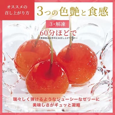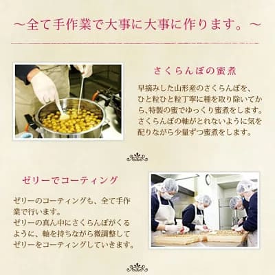 山形の果樹園で育ったさくらんぼの果実を、ひと粒ひと粒ていねいに種を取り、優しくゆっくり蜜煮をしてから、宝石のような丸い綺麗なゼリーで包みました。