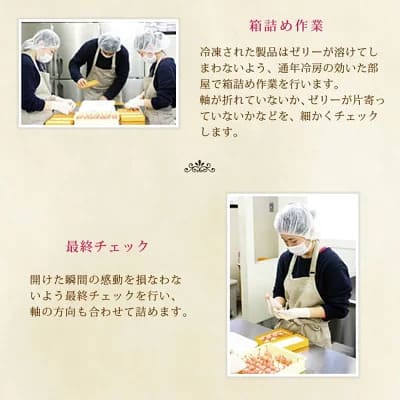 プチジェリチェリーは、職人がひとつずつ手作業で仕上げています。機械ではできない細やかな手仕事で仕上げています。日常のひとときに、優しい甘さと果実のフレッシュ感をお楽しみください。