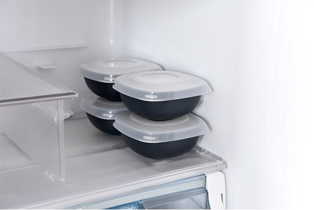 庫内で場所を取らない丸四角形状!スタッキングもOK!中身を確認できる透明な蓋とスノコなので保存容器としても◎!