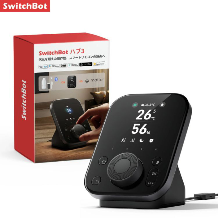 | 内容 | ハブ3本体×1、コントローラー×1、台座×1、温湿度センサー搭載ケーブル×1、ネジパック×1、5V/2Aアダプター×1、取付ステッカー×1、温湿度センサー両面テープ×1、スタンド用両面テープ×2 |