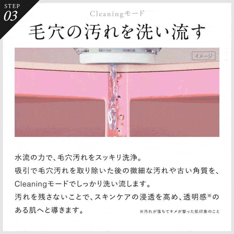 Cleaningモード(毛穴の汚れを洗い流す):水流の力で毛穴汚れをスッキリと洗浄。
