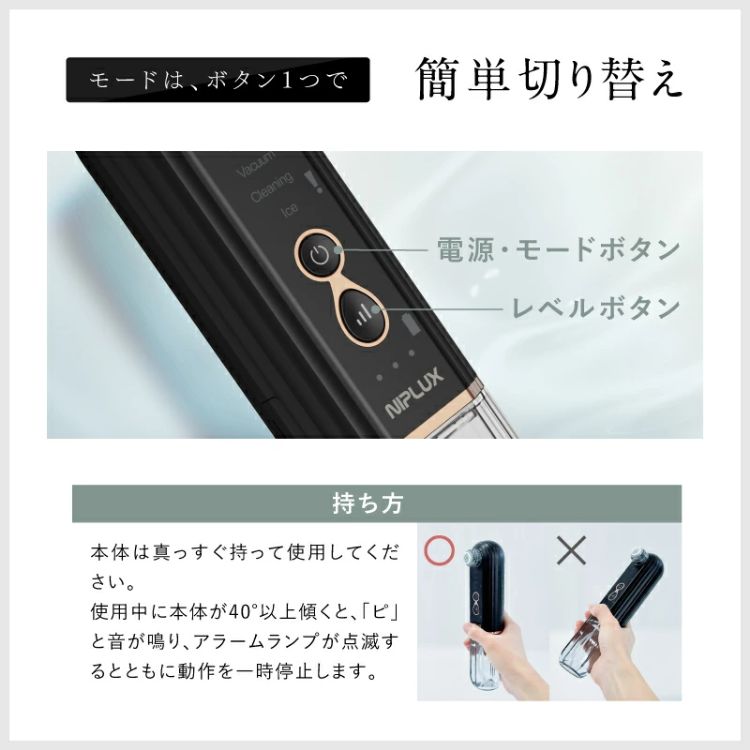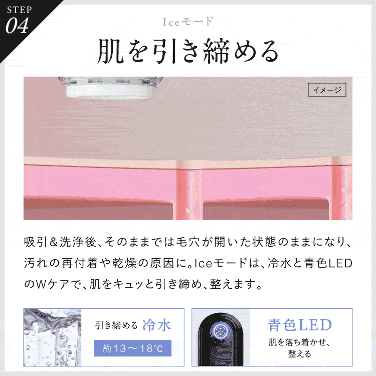Iceモード(肌を引き締める):吸引と洗浄後、毛穴が開いた状態をそのままにしておくと、汚れの再付着や乾燥の原因になります。