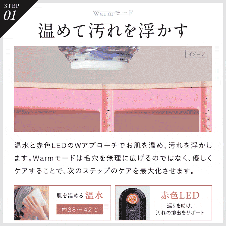 Warmモード(温めて汚れを浮かす):温水と赤色LEDのWアプローチで肌を温め、毛穴の汚れを浮かせます。