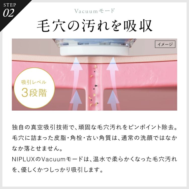Vacuumモードは、温水で柔らかくなった毛穴汚れを優しくかつしっかり吸引します。