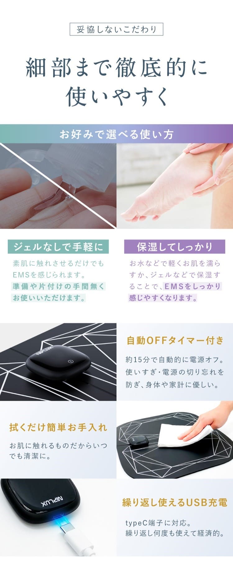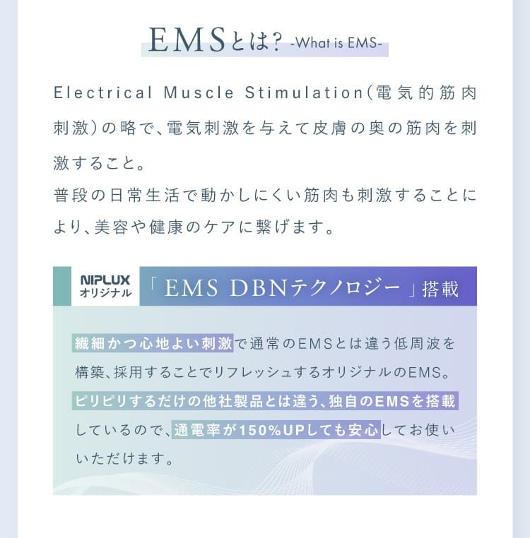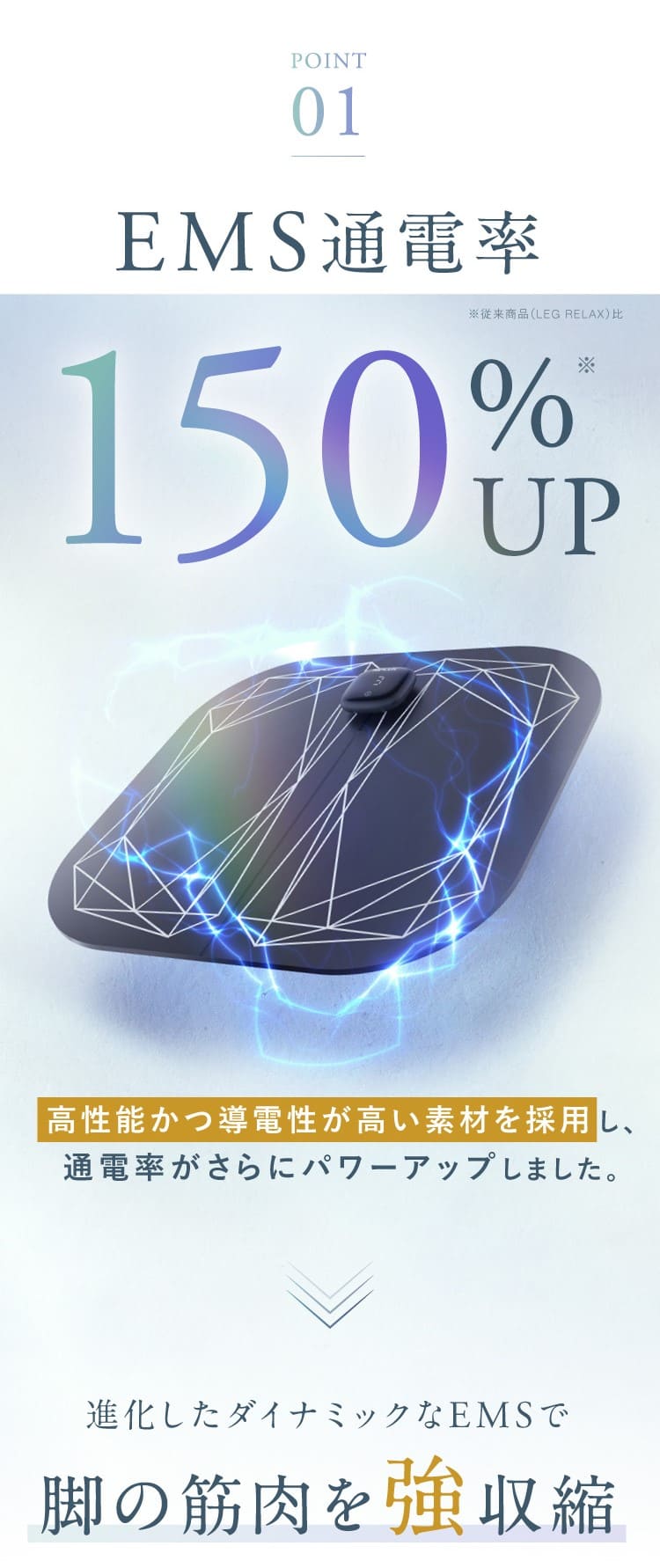 ・EMS通電率150%UP:筋肉への刺激をさらに感じられるように、高性能の伝導性シリコーンを採用し、通電率がさらにパワーアップしました。