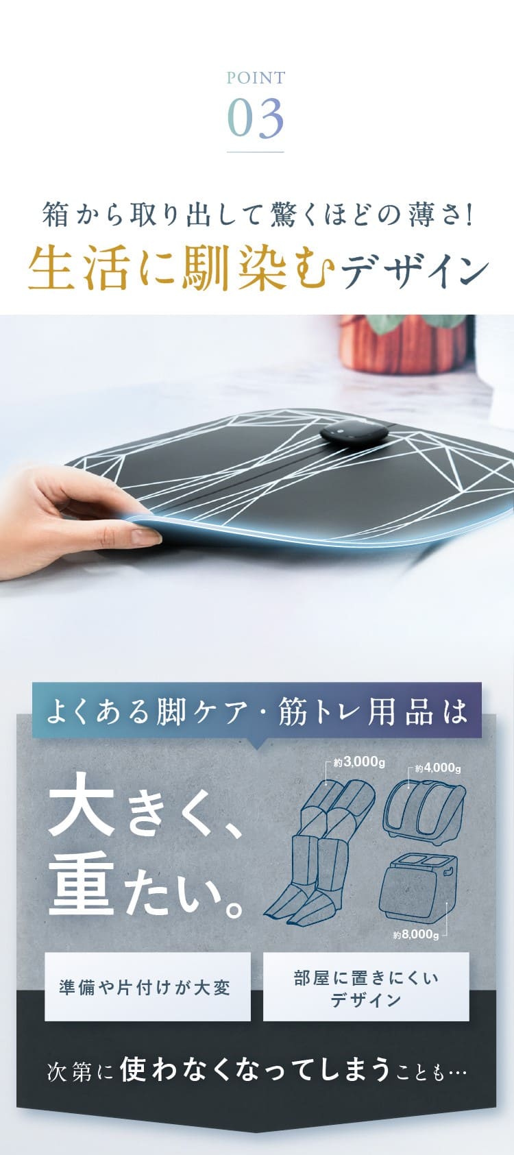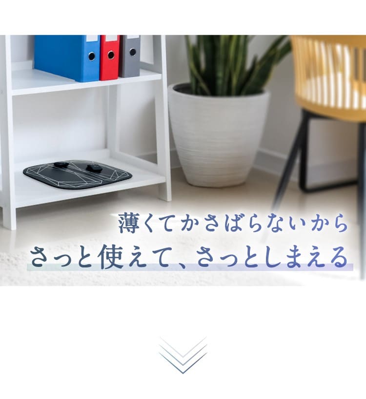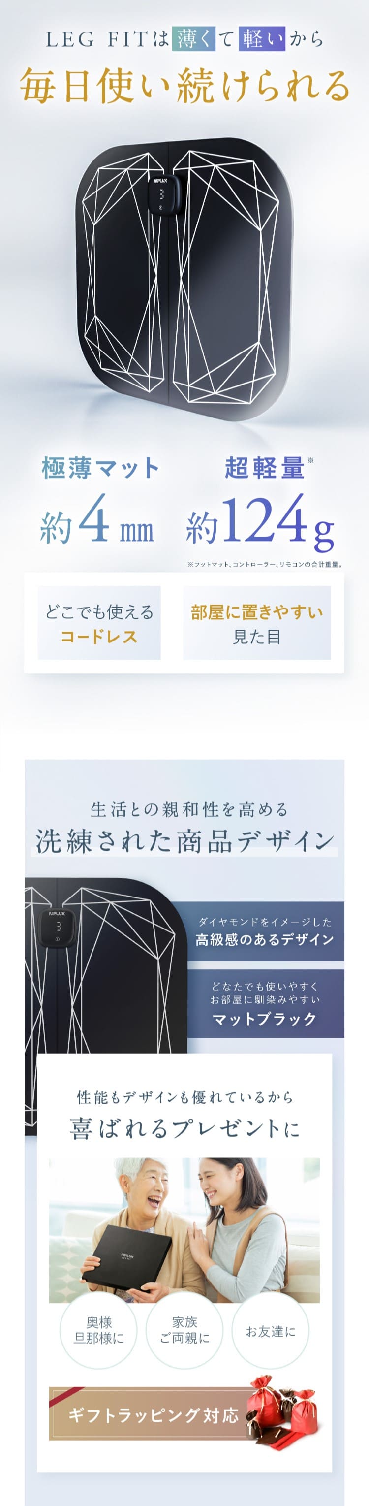 NIPLUX LEG FITは約124g(本体+リモコン)で、フットマットの薄さはわずか約4mmの超軽量設計です。