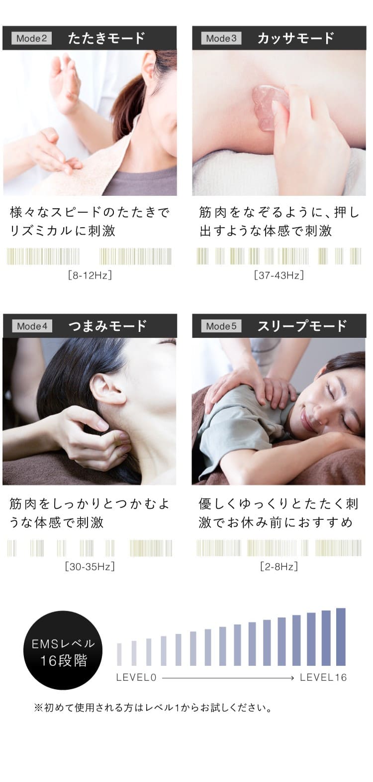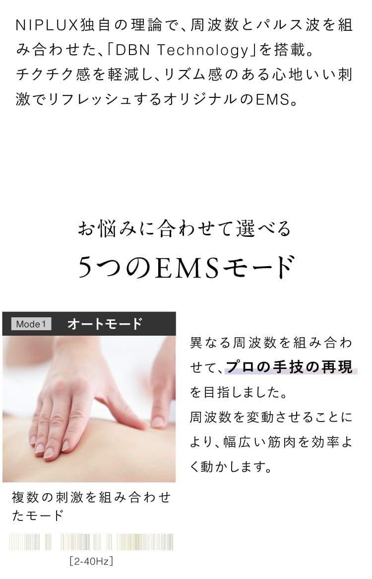 ・【5種類のEMSモード+16段階のEMSレベル】NIPLUX独自の理論に基づき、周波数とパルス波を組み合わせた[DBN Technology]を搭載。