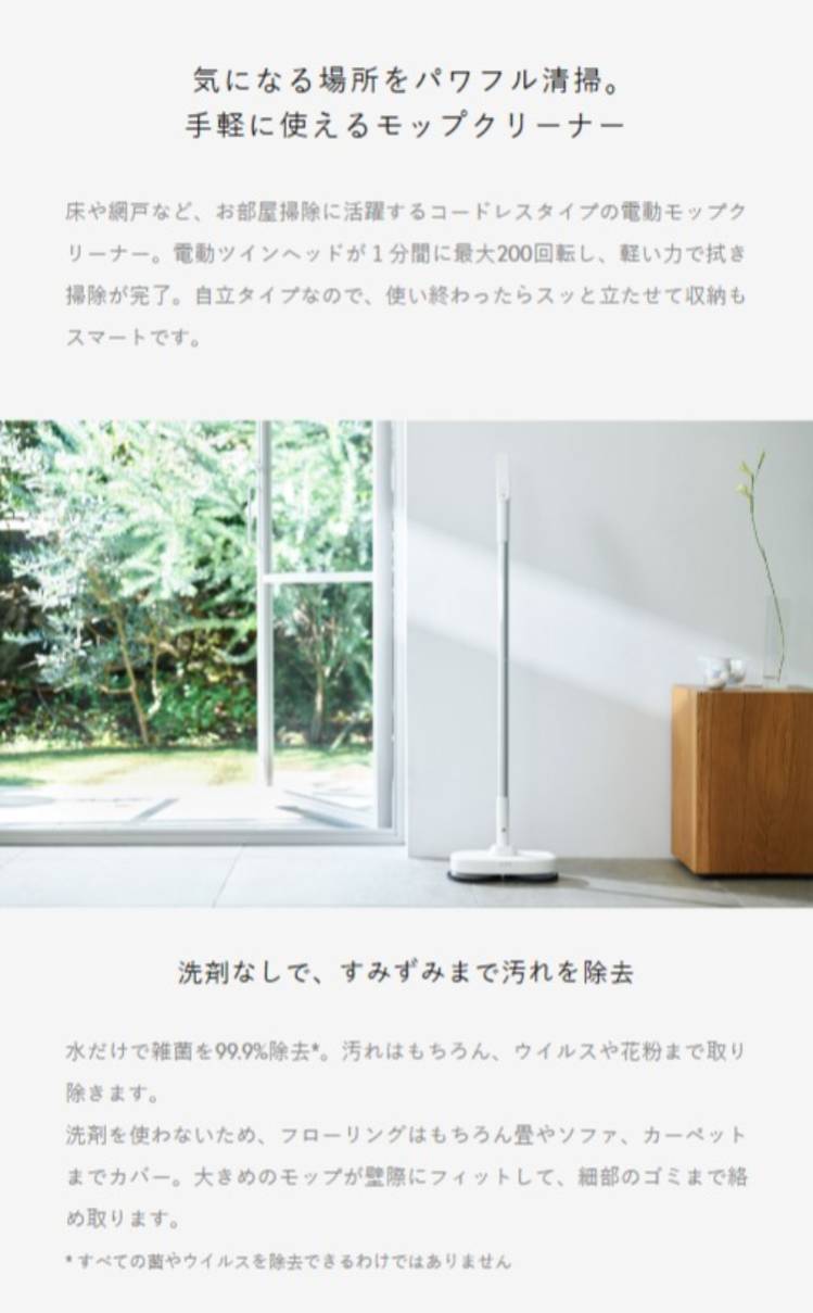 水の力で99.9%除菌。家じゅうをパワフルに清掃するコードレス電動モップクリーナーです。
