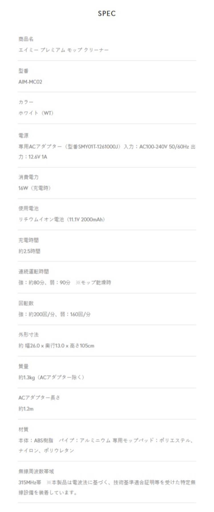 | 内容 | 【型番】 AIM-MC02 【カラー】 ホワイト(WT) 【電源】 専用ACアダプター(型番SMY01T-1261000J)入力:AC100-240V 50/60Hz 出力:12.6V 1A 【消費電力】 16W(充電時) 【使用電池】 リチウムイオン電池(11.1V 2000mAh) 【充電時間】 約2.5時間 【連続運転時間】 強:約80分、弱:90分 ※モップ乾燥時 【回転数】 強:約200回/分、弱:160回/分 【外形寸法】 約 幅26.0 × 奥行13.0 × 高さ105cm 【質量】 約1.3kg(ACアダプター除く) 【ACアダプター長さ】 約1.2m 【材質】 本体:ABS樹脂 パイプ:アルミニウム 専用モップパッド:ポリエステル、ナイロン、ポリウレタン 【無線周波数帯域】 315MHz帯 ※本製品は電波法に基づく、技術基準適合証明等を受けた特定無線設備を装着しています。 |