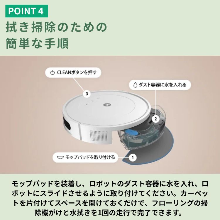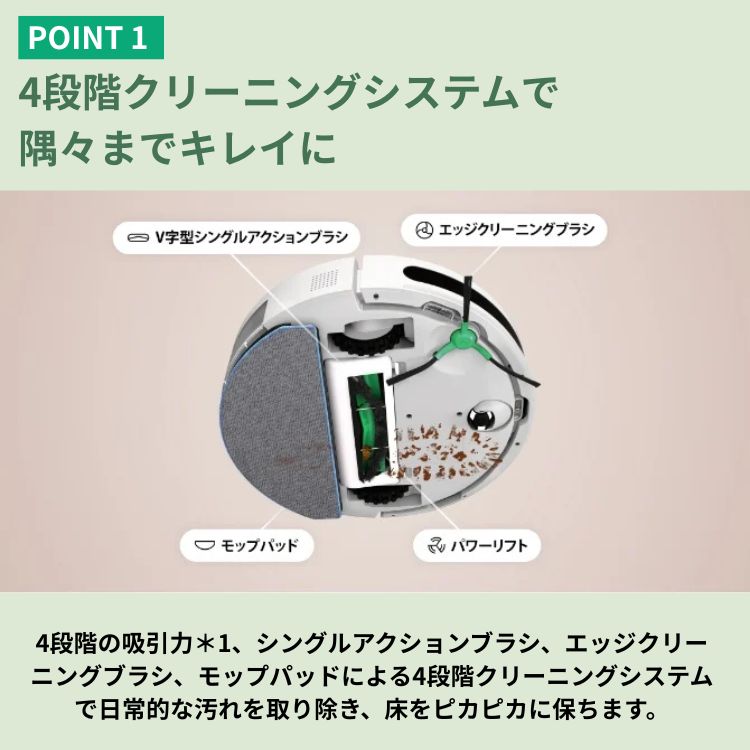 4段階クリーニングシステムで掃除機がけから水拭きまですべてお任せ。