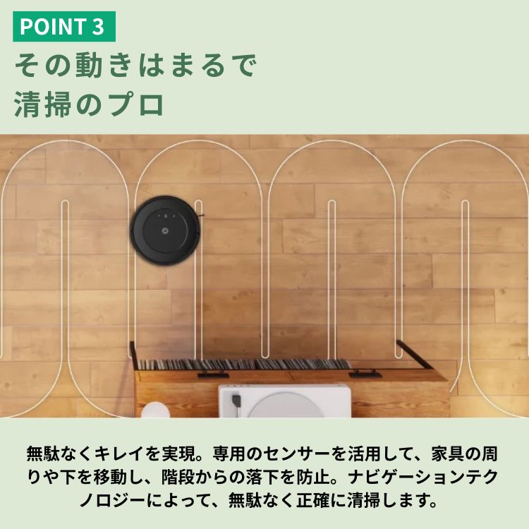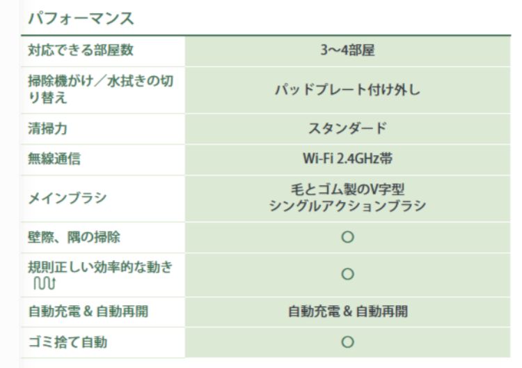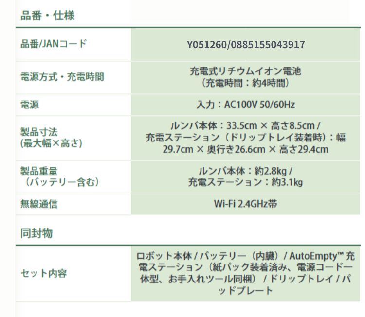 ・電源方式・充電時間:充電式リチウムイオン電池 (充電時間:約4時間) ・電源 入力:AC100V 50/60Hz ・製品寸法(最大幅×高さ) ルンバ本体:33.5cm × 高さ8.5cm / ・充電ステーション(ドリップトレイ装着時):幅29.7cm × 奥行き26.6cm × 高さ29.4cm ・製品重量 (バッテリー含む) ルンバ本体:約2.8kg / 充電ステーション:約3.1㎏ ・無線通信 Wi-Fi 2.4GHz帯 |