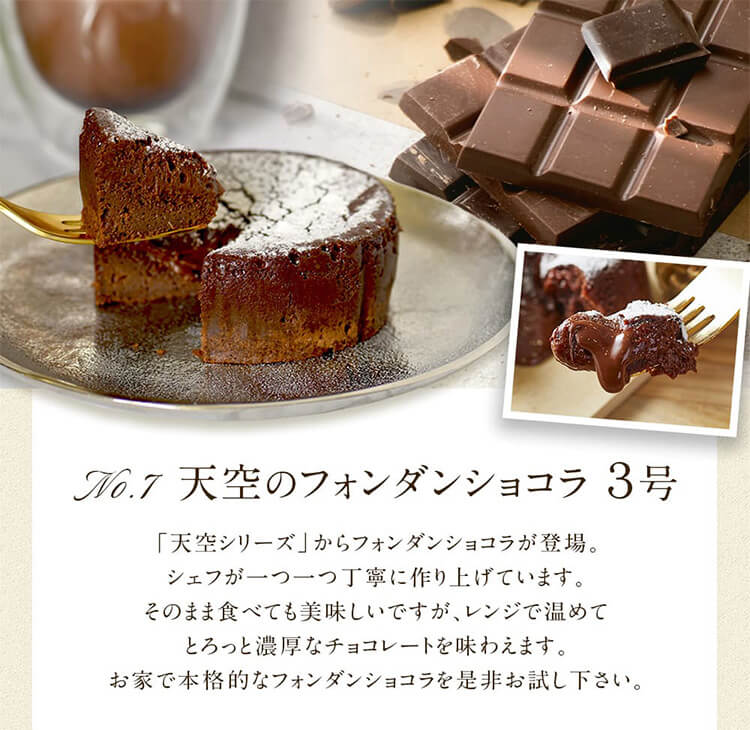 | 原材料 | 【スフレ】 クリームチーズ(国内製造)、生クリーム、卵、砂糖、小麦粉、コーンスターチ、バター、レモン果汁、植物油脂、レモンピール、マスカルポーネチーズ、牛乳、蜂蜜、ゼラチン、バニラビーンズ/トレハロース、バニラ香料、(一部に乳成分・卵・小麦・ゼラチンを含む) 【フォンダンショコラ】 卵(国内製造)、チョコレート、バター、グラニュー糖、小麦粉/(一部に卵・乳成分・小麦・大豆を含む) |