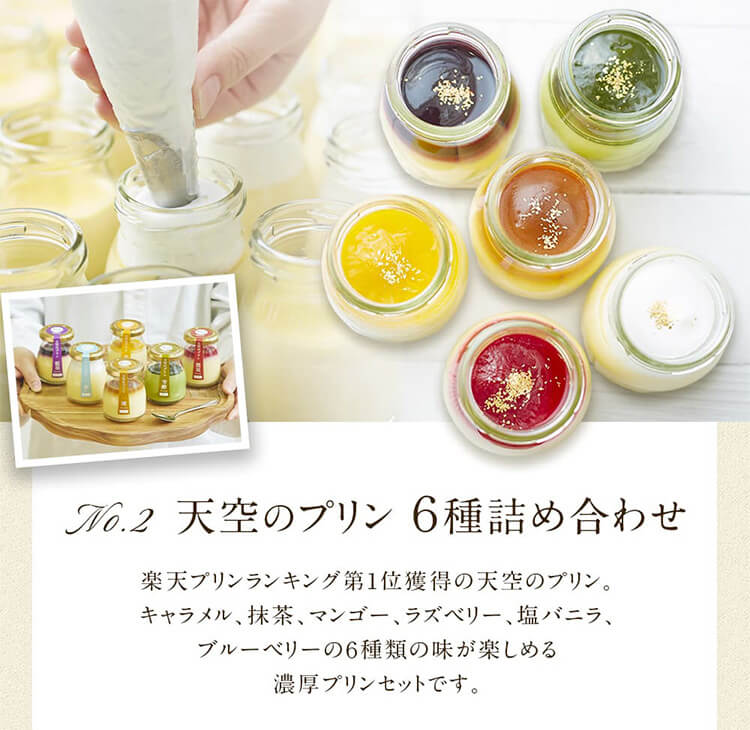 | 原材料2 | 【プリンアソート】 ・天空プリン雅(キャラメル) 生クリーム(国内製造)、牛乳、卵黄、砂糖、バター、塩(宮古島雪塩)/トレハロース、バニラペースト、金箔、(一部に乳製分・卵含む) ・天空プリン芳醇(抹茶) 生クリーム(国内製造)、牛乳、卵黄、こし餡、砂糖、抹茶/トレハロース、イナアガー(増粘多糖類)、金箔、(一部に乳成分・卵を含む) ・天空プリン芒果(マンゴー) 生クリーム(国内製造)、牛乳、卵黄、ココナッツ、砂糖、ココナッツミルク、マンゴーピューレ、パッションピューレ、ゼラチン/トレハロース、金箔、(一部に乳成分・卵・ゼラチンを含む) |