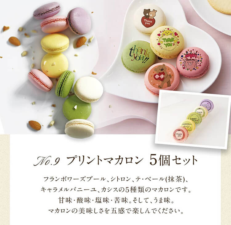 | 原材料4 | 【プリントマカロン】 ・フランボワーズ 砂糖(国内製造)、アーモンド、卵、ラズベリー、バター、牛乳、レモン/ゲル化剤(ペクチン)、食用色素(赤102・黄4・青1)、(一部に乳成分・卵・アーモンドを含む) ・シトロン 砂糖(国内製造)、コーンスターチ、アーモンド、卵、レモン、バター/食用色素(赤102・黄4・青1)、(一部に乳成分・卵・アーモンドを含む) ・カシス 砂糖(国内製造)、アーモンド、卵、ブルーベリー、バター、カシス、コーンスターチ/食用色素(赤102・黄4・青1)、(一部に乳成分・卵・アーモンドを含む) |