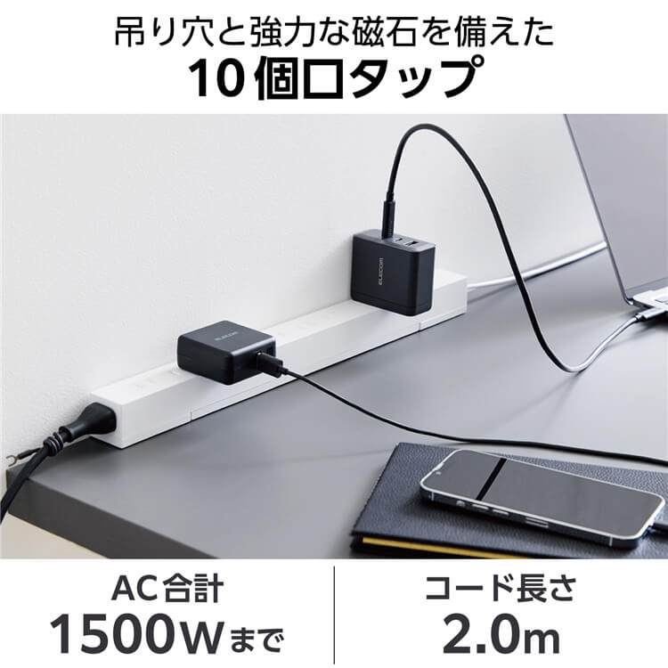 回転収納可能な脚パーツと強力な磁石を特長とする2ピン式のスリムな10個口タップです。