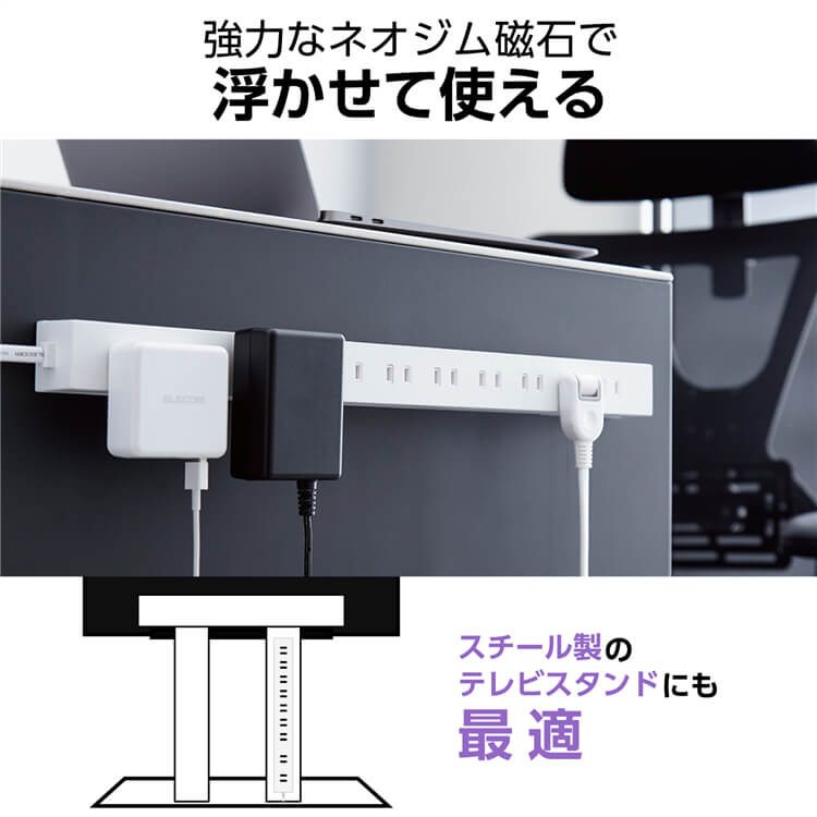 ■回転収納可能な脚パーツでタップの横転を防止!吊り穴と強力な磁石を備えた、2ピン式のスリムな10個口タップです。