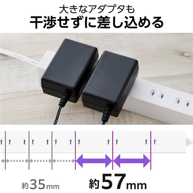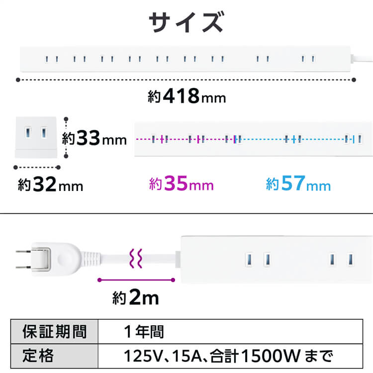 | 内容 | ■外形寸法:幅32mm×奥行418mm×高さ33mm ※本体のみ(突起部を除く) ■ACコード長:約2m ■質量:約500g ■差込口間隔:広いところ57mm、狭いところ35mm ■保証期間:1年間 |