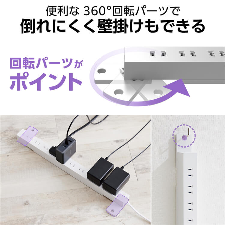 ■360度回転可能な脚パーツは展開することで、重いACアダプターなどを接続してもタップが横転しにくくなります。