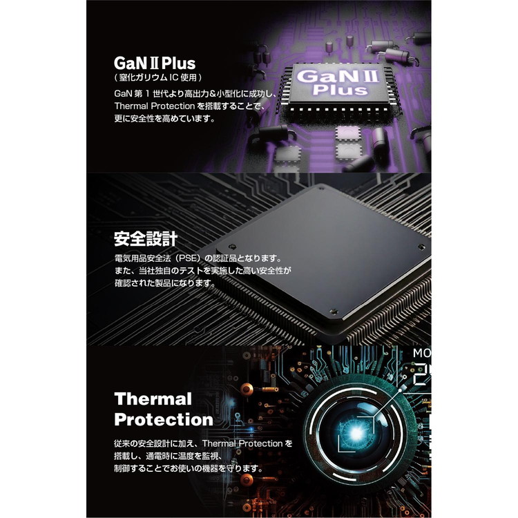 | 内容 | ■対応機種:各USB Type-C(TM)ポートからUSB Power Delivery 67WおよびPPS 49.5W、またはUSB-Aポートから12Wの規格内で充電可能なノートパソコン、スマートフォンなどの機器。2ポート以上同時接続時、合計最大65Wまでの出力で充電・給電可能な機器とその組み合わせ。 ■コネクター形状:USB Type-Cポート×2、USB-Aポート×1 ■外形寸法:幅約60mm×奥行約13mm×高さ約70mm ※本体のみ、ケーブルと突起部を除く ■重量:約295g ■カラー:ホワイト ■保証期間:1年間 ■使用可能地域:日本 ■ACコード長:約1.5m |