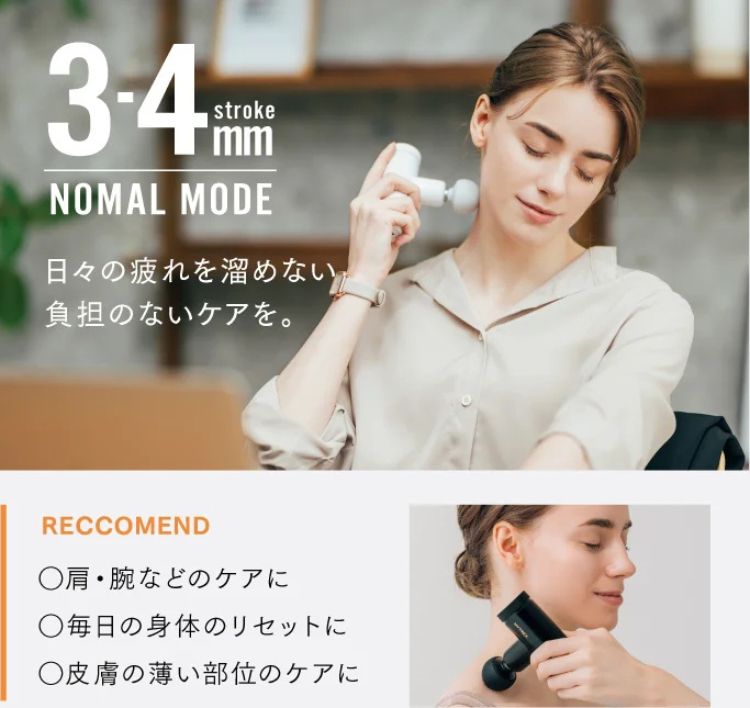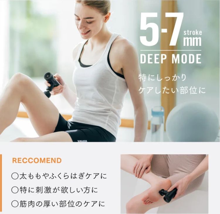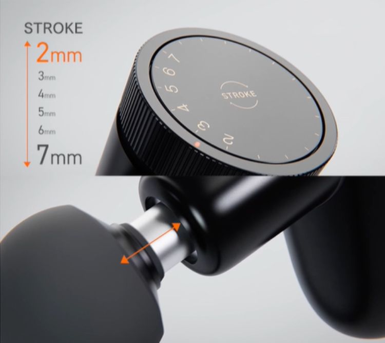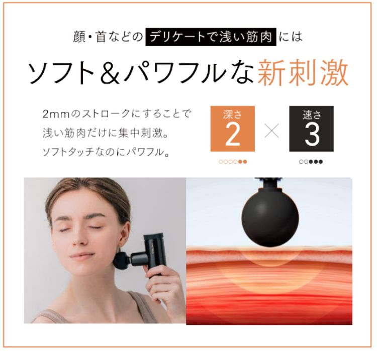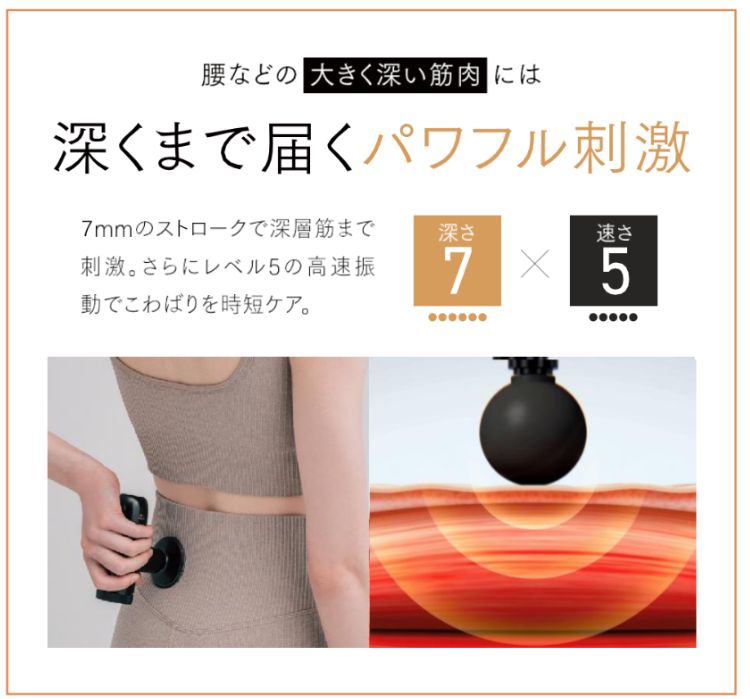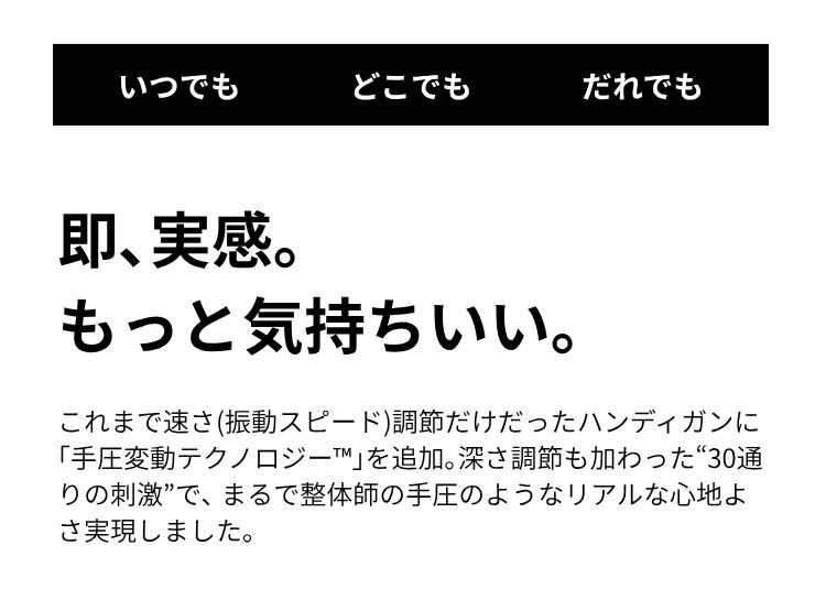 従来では速さ(振動スピード)調節のみだったハンディガンに【手圧変動テクノロジー】が加わり、新しく深さ(ストローク)の調整が可能に。