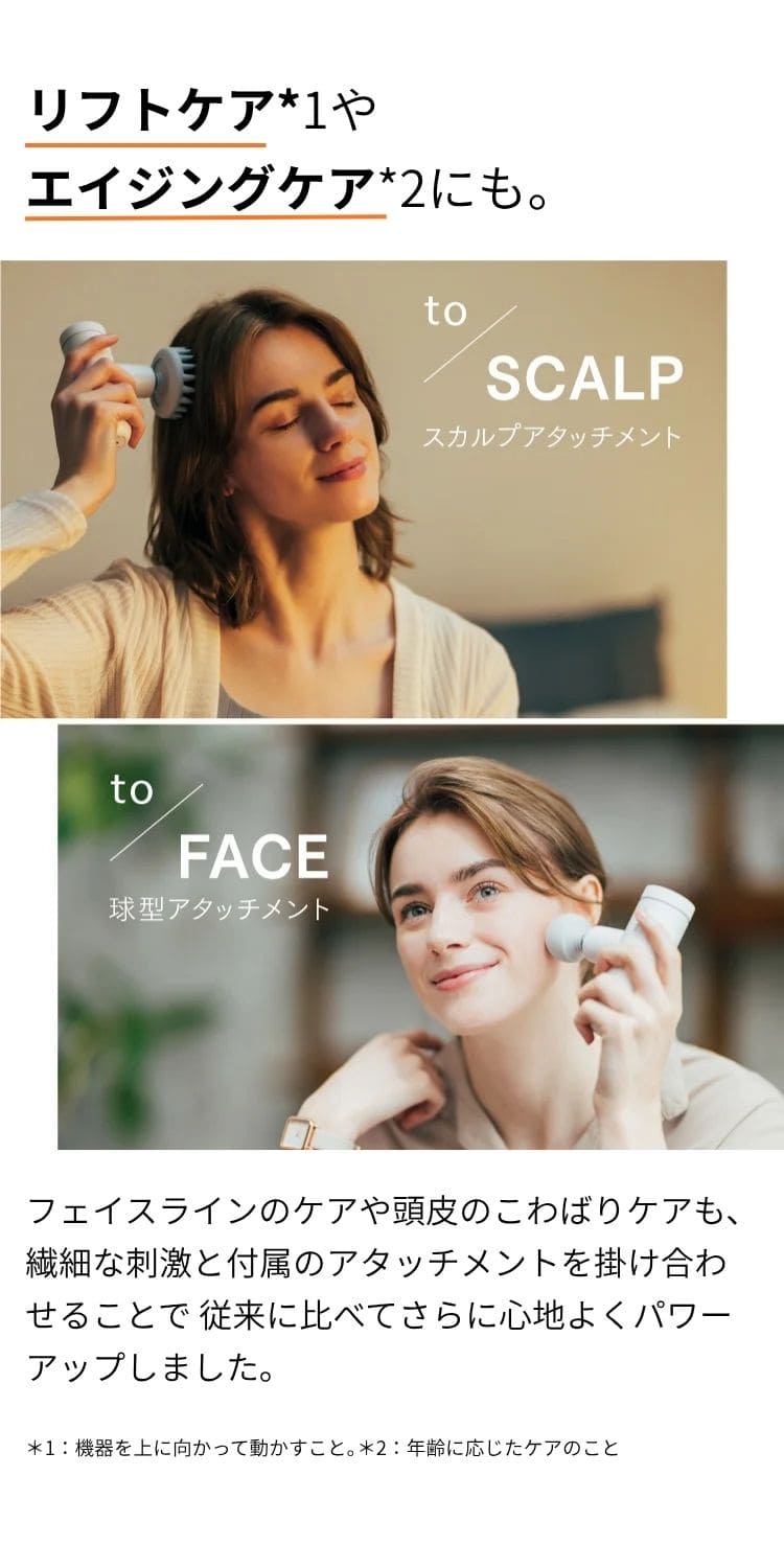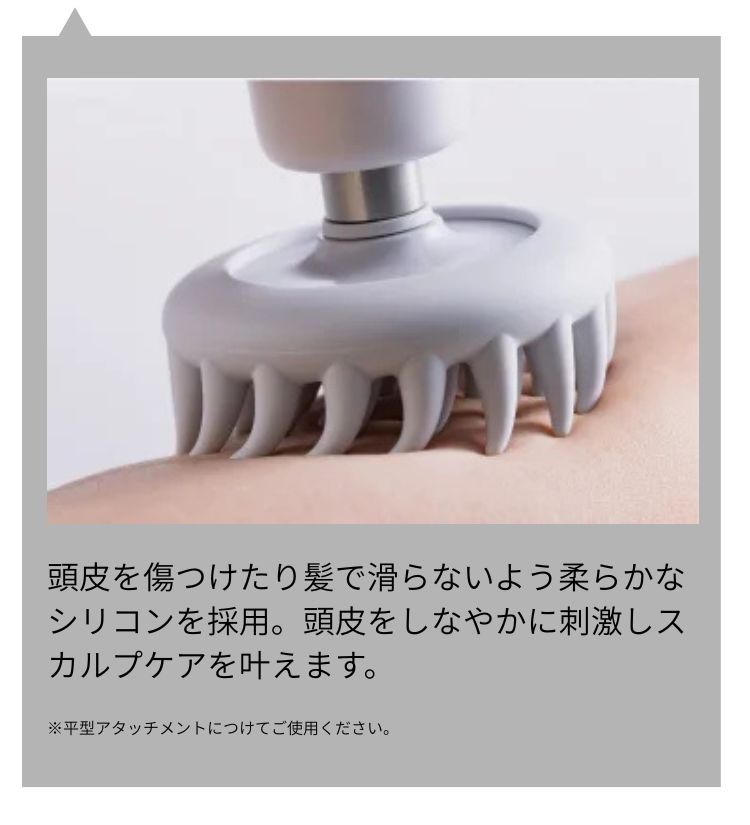 | 内容 | 本体:1台/充電用USBコード:1本/アタッチメント:5種類* アタッチメント用ストッパーゴム (予備):2個/取扱説明書:1部 携帯用布袋:1個 *スカルプ装着アタッチメントを含む。 |