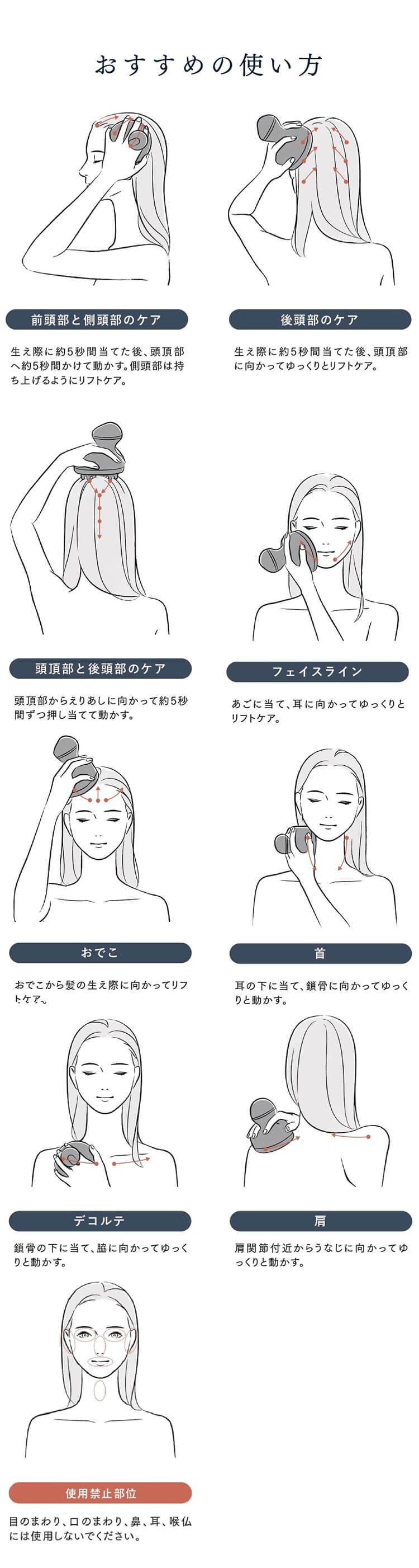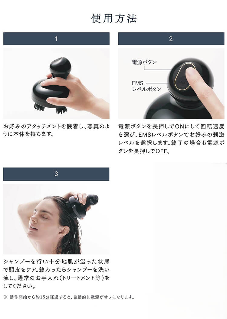 | 内容 | ●セット内容 本体(1台)、取扱説明書1部、USBコード1本、充電台1台、掃除用ブラシ2個、ACアダプター1個、アタッチメント3種・12個(頭皮専用4個/頭皮&ボディ用4個/フェイス用4個) |