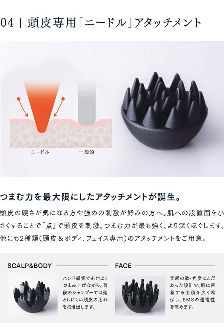 ニードルアタッチメントも加わって、より効果的な頭皮ケアを可能にしました。
