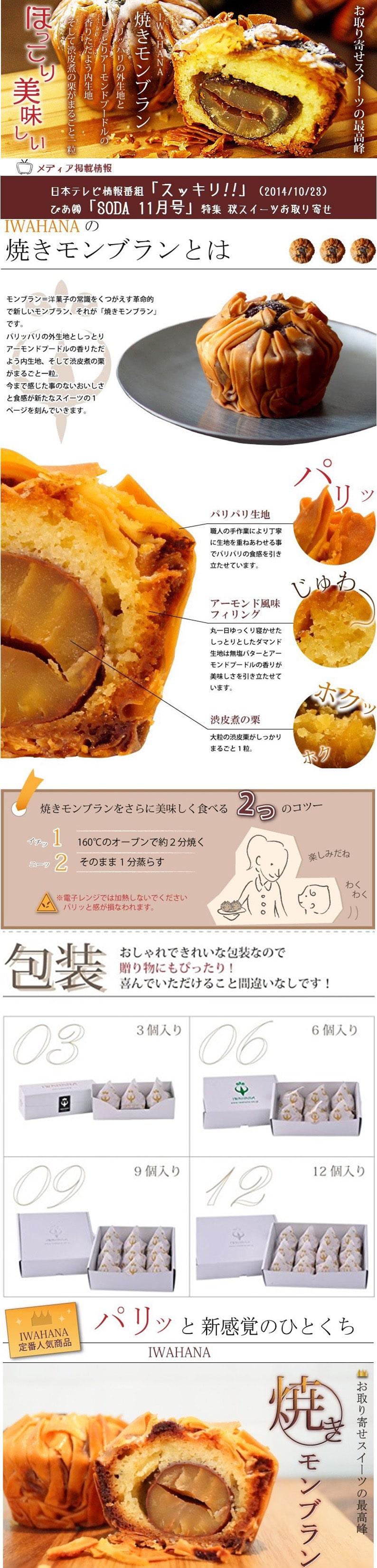 | 原材料 | 焼きモンブラン:渋皮栗甘露煮(国内製造)、小麦粉、液鶏卵、バター、粉末アーモンド、カスタードクリーム、粉糖(砂糖、デキストリン、でん粉)、砂糖、ショートニング、でん粉、ホエイパウダー、加工油脂/加工でん粉、酒精、トレハロース、pH調整剤、ソルビトール、グリシン、乳化剤、香料、カロチノイド色素、(一部に小麦・卵・乳成分・大豆を含む) |