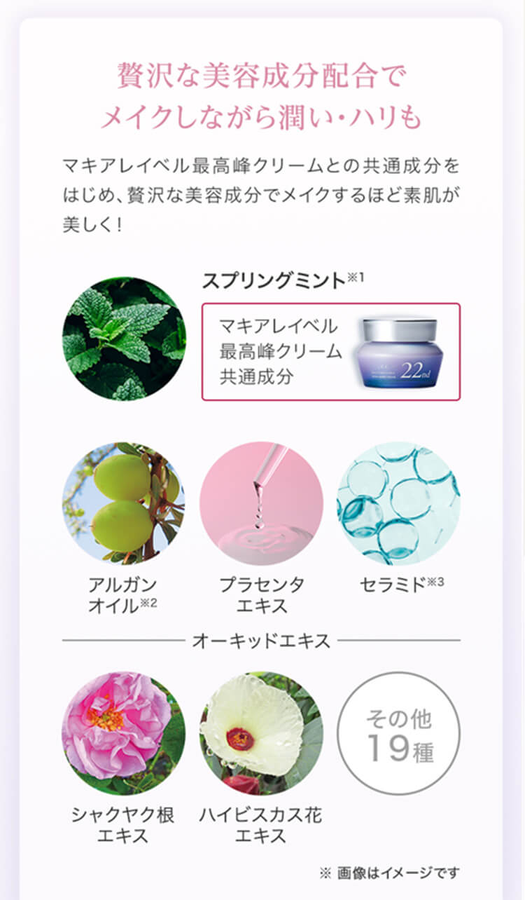 マキアレイベル最高峰クリームとの共通成分をはじめ、贅沢な美容成分でメイクするほど素肌が美しく!