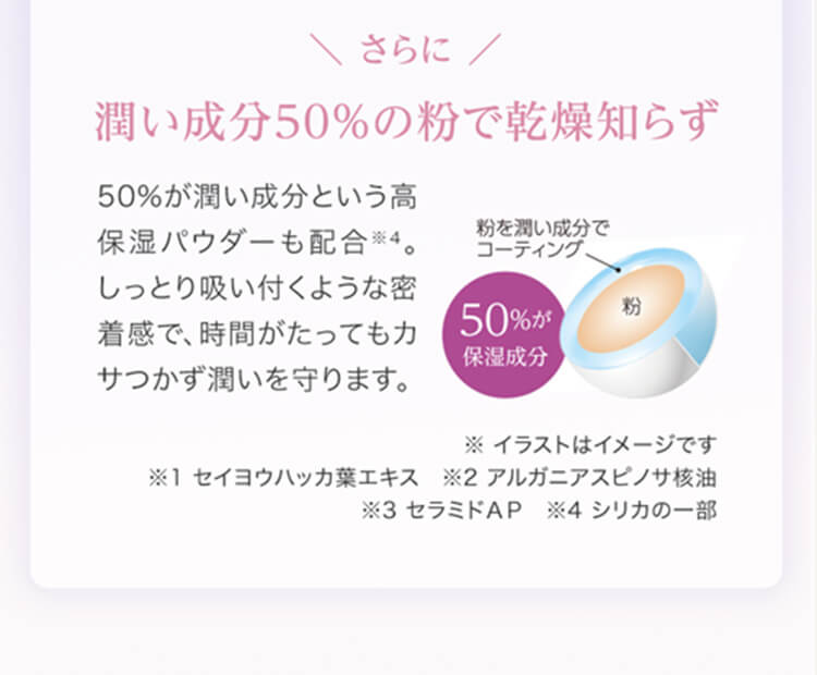 潤い成分50%の高保湿パウダー配合*2で、時間がたってもカサつかず潤いを守ります。