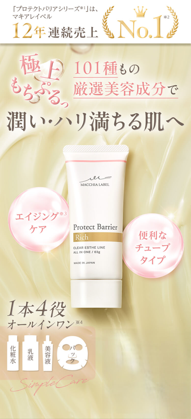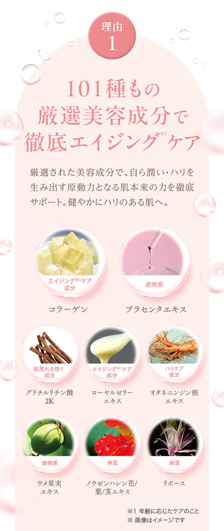 101種の美容成分配合で、お肌に潤い・ハリを与えます。