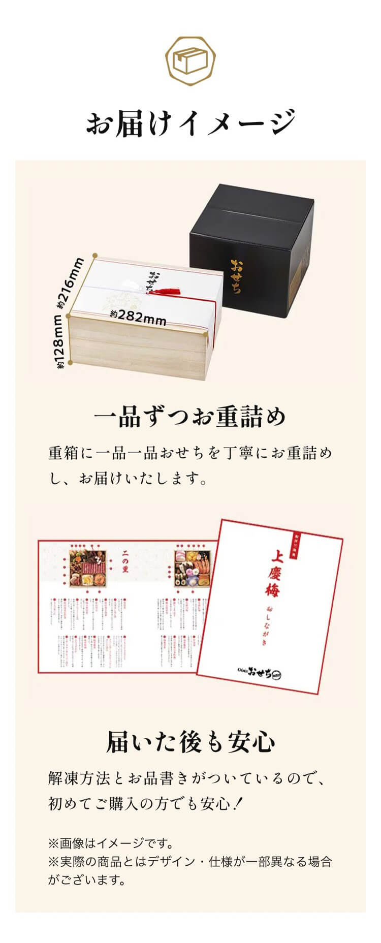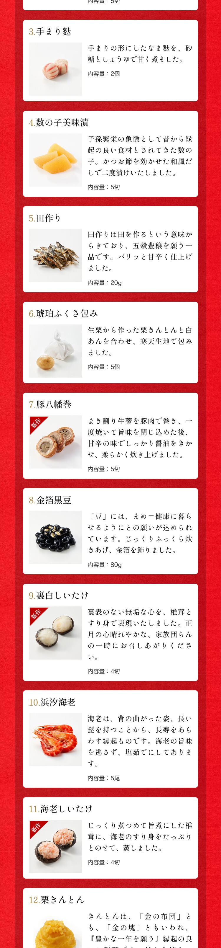 | 内容 | 内容量:5人前 品目数:32品目 サイズ:2段重(サイズ縦216×横282×高さ128(mm)) |