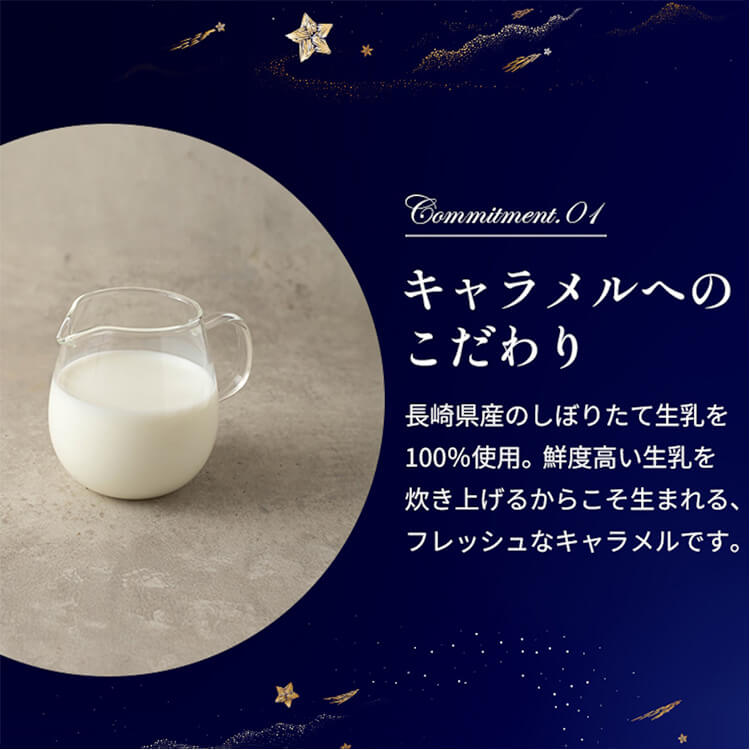 | 原材料 | キャラメル 生乳(長崎県産)生クリーム 粗糖 蜂蜜 粉糖(グラニュー糖 パーム油 コーンスターチ)塩 グリーンティー 生乳(長崎県産)生クリーム 粗糖 蜂蜜 粉糖(グラニュー糖 パーム油 コーンスターチ)緑茶葉 塩 / 乳化剤、香料 あまおう 生乳(長崎県産)生クリーム 粗糖 苺ペースト(あまおう、レモン汁) 蜂蜜 粉糖(グラニュー糖 パーム油 コーンスターチ)塩 苺パウダー(デキストリン)/ ゼラチン ショコラ 生乳(長崎県産)生クリーム 粗糖 チョコレート 蜂蜜 粉糖(グラニュー糖 パーム油 コーンスターチ)塩 / 乳化剤、香料 |