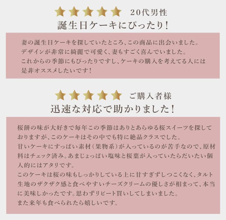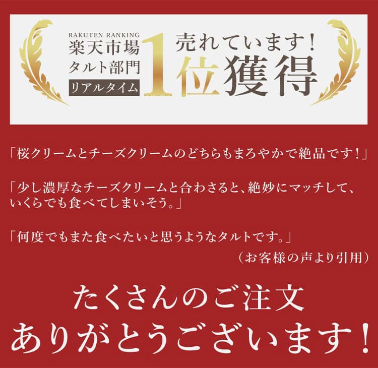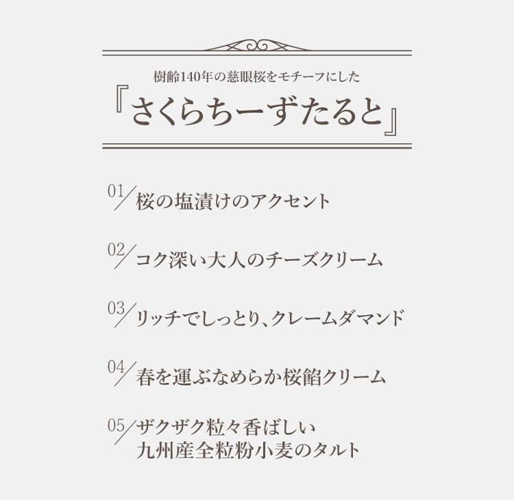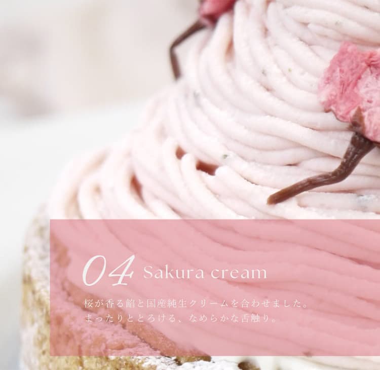 | 原材料 | 生クリーム(国内製造)、桜餡(白生あん、砂糖、桜葉塩漬)、クリームチーズ、粗糖、小麦粉、バター、アーモンドプードル、全粒粉小麦粉、卵 、桜葉、食塩 添加物、ゼラチン、トレハロース、コチニール色素、ミョウバン (一部に乳成分、卵、小麦を含む) |