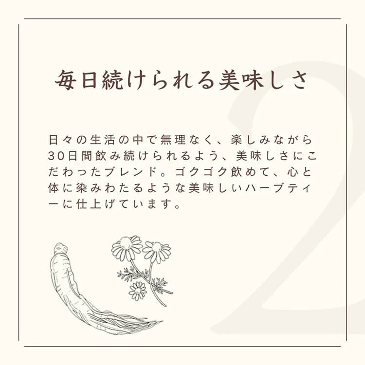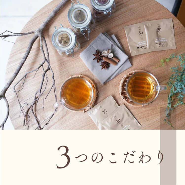 | 原材料 | ルイボスレッド、ラズベリーリーフ、ローズヒップ、ネトル、たんぽぽの根、マルベリー、カモマイルジャーマン、リンデンフラワー |