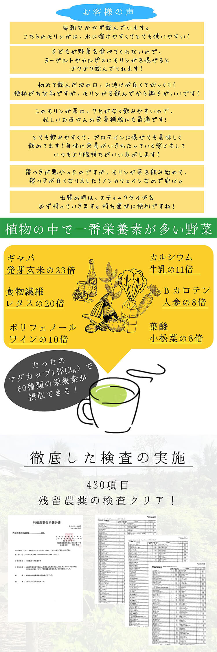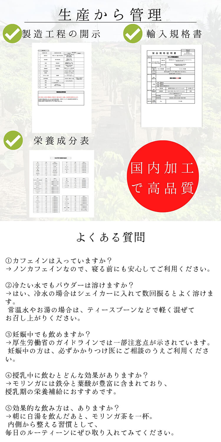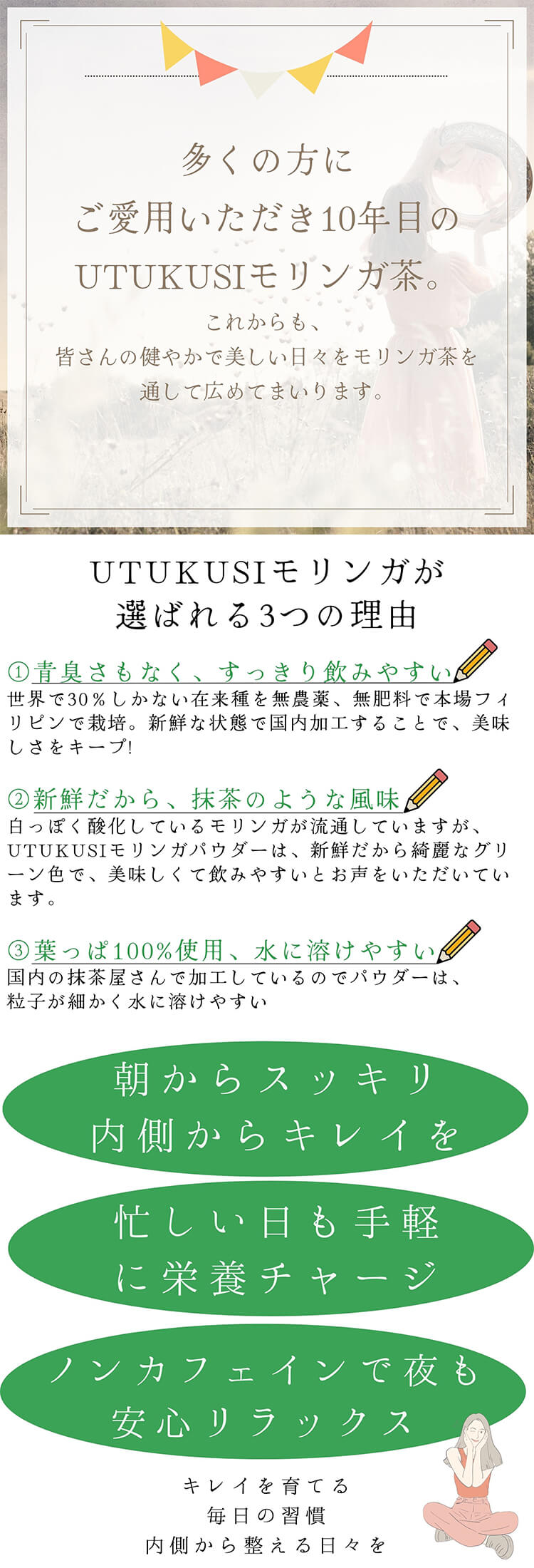 UTUKUSIのモリンガは、農薬・化学肥料不使用の茶葉100%。添加物も一切使わず、人にも地球にもやさしい品質。
